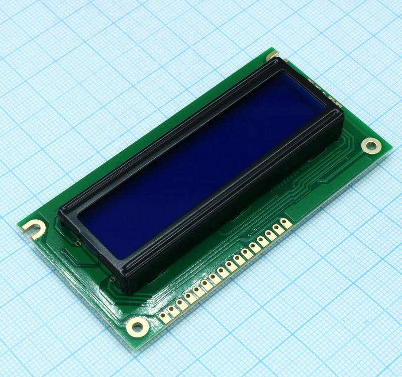 ЖКИ знакосинтезирующий 16 x 2, STN Синяя Негативный/прозрачный светодиодная подсветка Белая, размеры 84×44 мм, видимая область 66×16 мм, -20…70°C, контактные площадки снизу 16 выводов